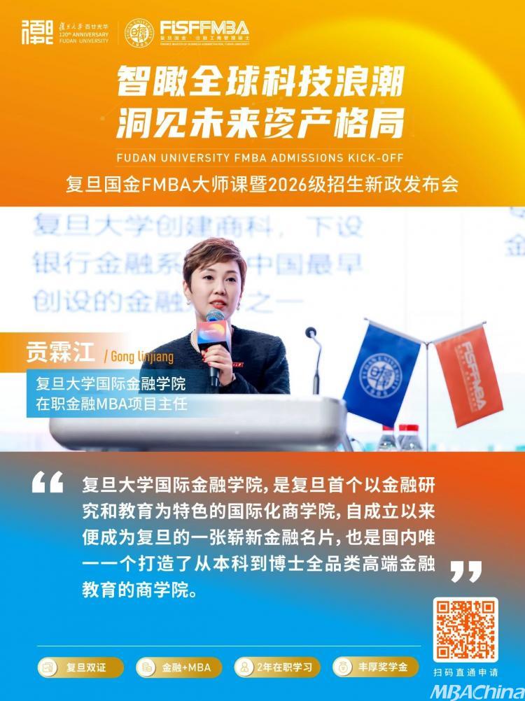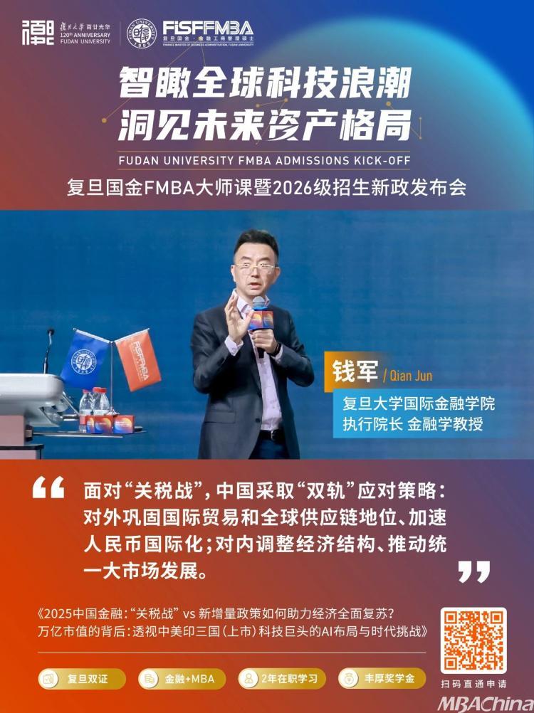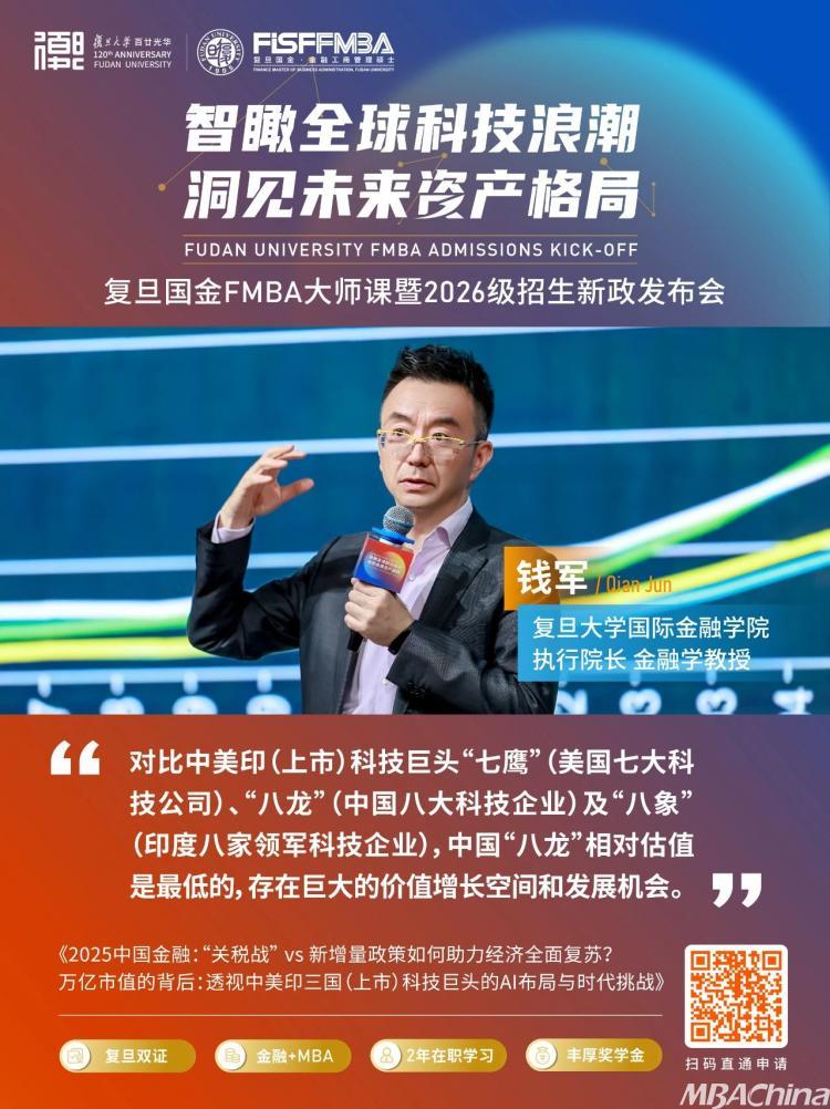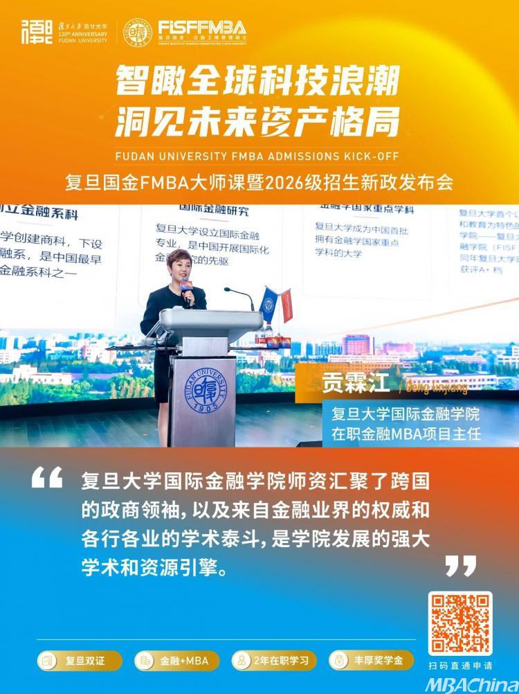 在復(fù)旦大學(xué)國際金融學(xué)院FMBA大師課暨2026級招生新政發(fā)布會(huì)上,錢軍教授破局“關(guān)稅戰(zhàn)”,洞悉AI時(shí)代全球產(chǎn)業(yè)變革與中美印三國科技企業(yè)市場估值對比;貢霖江老師解讀金融領(lǐng)袖培養(yǎng)之道。首期班校友重逢分享在復(fù)旦FMBA的學(xué)習(xí)經(jīng)歷對職業(yè)發(fā)展的賦能、潛在機(jī)遇及人生信條。這是一場知識盛宴與思想啟迪。復(fù)旦金融MBA致力于為精英提供頂級學(xué)習(xí)平臺、賦能引擎和精英網(wǎng)絡(luò)。今年在職金融MBA重磅推出2026級“預(yù)備生賦能工作坊”,2小時(shí)領(lǐng)略課堂魅力、了解課程項(xiàng)目,還有機(jī)會(huì)獲至高50000元獎(jiǎng)學(xué)金,鼓勵(lì)有志者把握機(jī)遇。