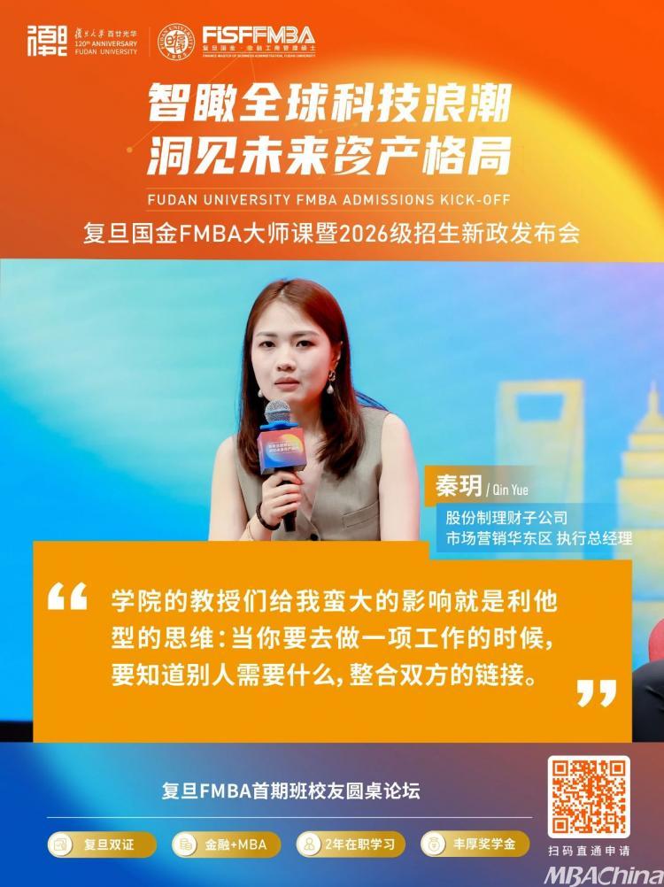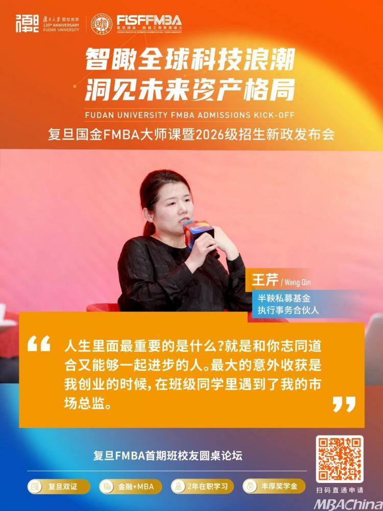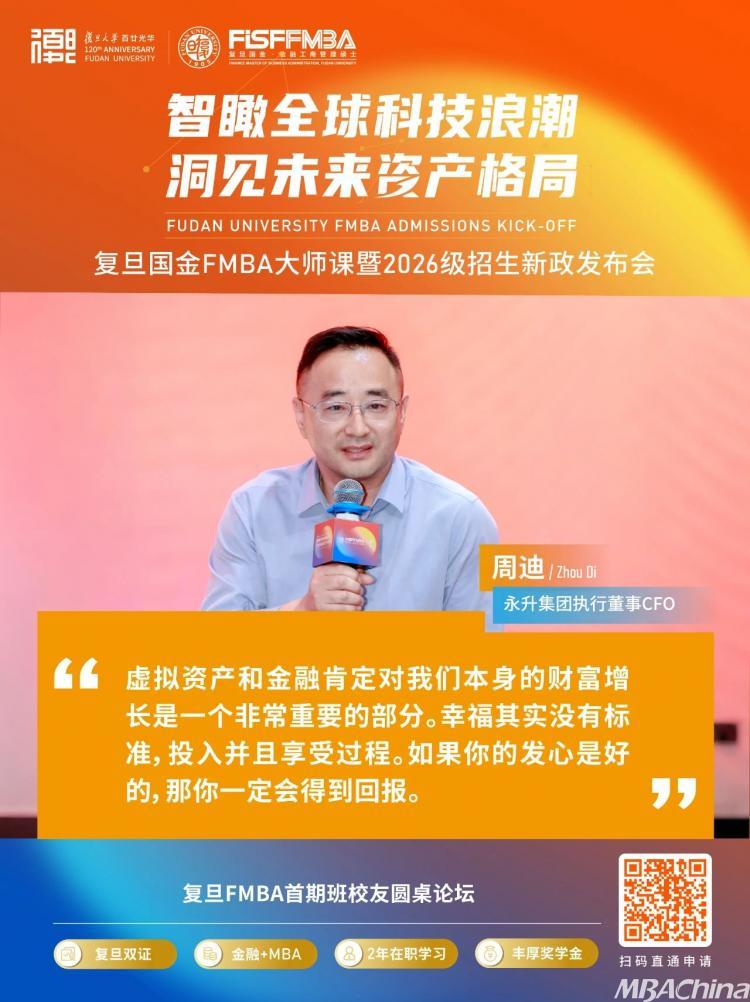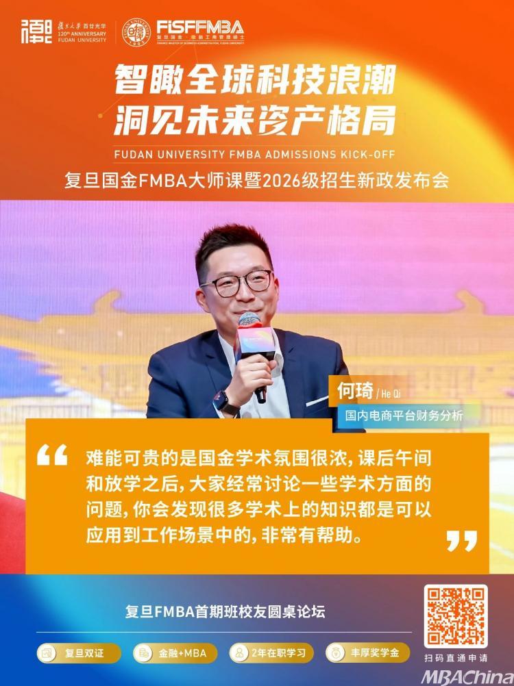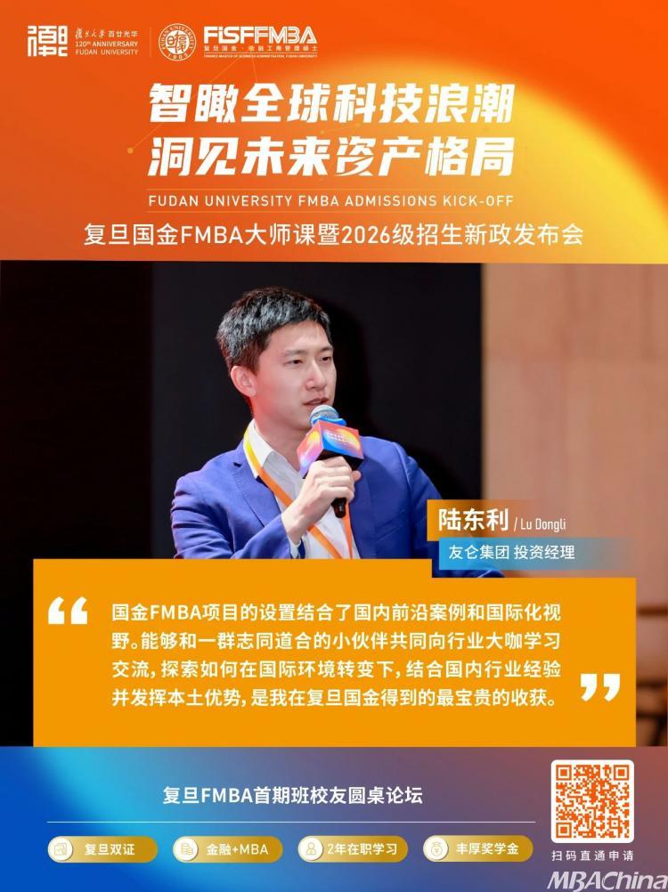 在復(fù)旦大學(xué)國際金融學(xué)院FMBA大師課暨2026級招生新政發(fā)布會(huì)上,錢軍教授破局“關(guān)稅戰(zhàn)”,洞悉AI時(shí)代全球產(chǎn)業(yè)變革與中美印三國科技企業(yè)市場估值對比;貢霖江老師解讀金融領(lǐng)袖培養(yǎng)之道。首期班校友重逢分享在復(fù)旦FMBA的學(xué)習(xí)經(jīng)歷對職業(yè)發(fā)展的賦能、潛在機(jī)遇及人生信條。這是一場知識盛宴與思想啟迪。復(fù)旦金融MBA致力于為精英提供頂級學(xué)習(xí)平臺、賦能引擎和精英網(wǎng)絡(luò)。今年在職金融MBA重磅推出2026級“預(yù)備生賦能工作坊”,2小時(shí)領(lǐng)略課堂魅力、了解課程項(xiàng)目,還有機(jī)會(huì)獲至高50000元獎(jiǎng)學(xué)金,鼓勵(lì)有志者把握機(jī)遇。