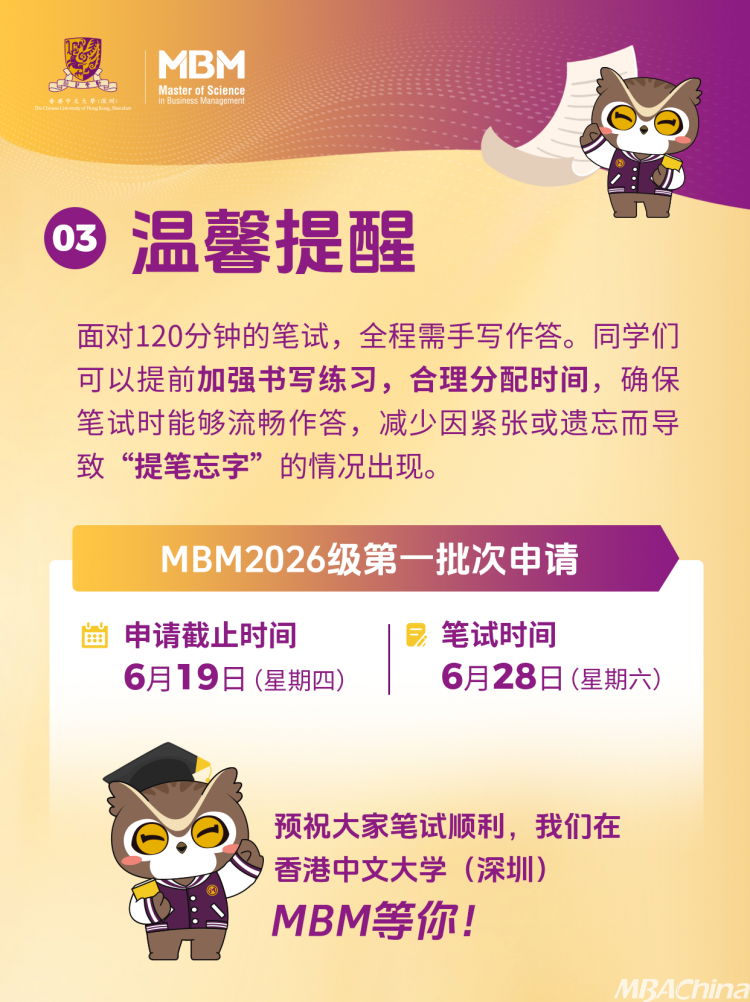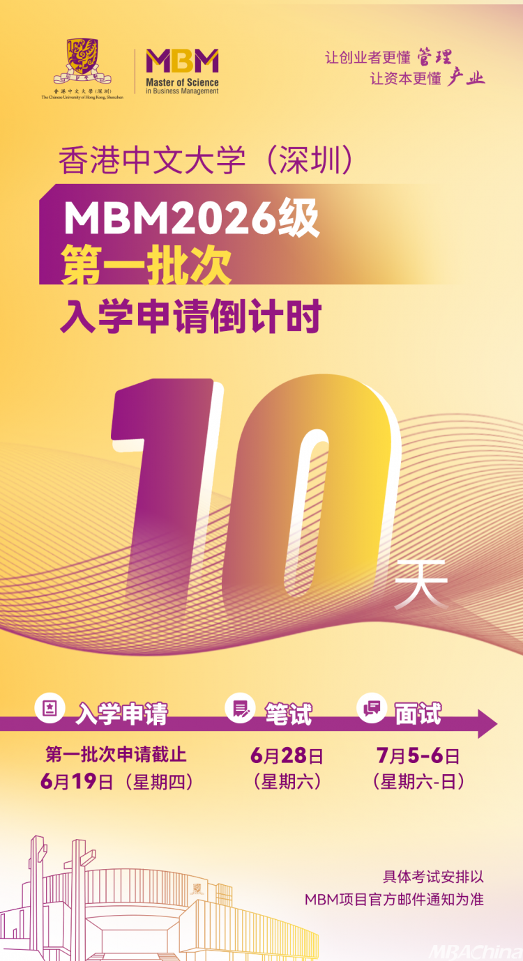 倒計時10天!香港中文大學(深圳)管理學理學碩士MBM2026級第一批次入學申請將于2025年6月19日(星期四)24:00截止!