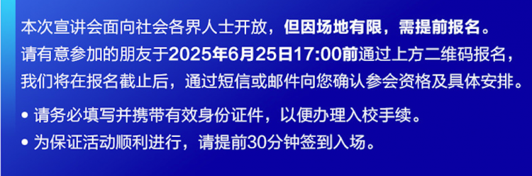 本次活動亮點(diǎn)豐富,可聆聽白重恩院長深度解讀全球經(jīng)濟(jì)與創(chuàng)新趨勢以把握商業(yè)機(jī)遇,深入了解清華MBA項(xiàng)目全覽,包括項(xiàng)目設(shè)置、培養(yǎng)目標(biāo)與職業(yè)發(fā)展路徑,還能與成功校友交流獲取職業(yè)成長經(jīng)驗(yàn)?;顒佑?025年6月29日13:30 - 15:30在清華大學(xué)主樓后廳舉行,13:00 - 13:30簽到入場,之后依次進(jìn)行清華MBA項(xiàng)目介紹、紫荊課堂《中國經(jīng)濟(jì)大轉(zhuǎn)型》、同學(xué)與校友分享。報(bào)名方式為掃描或長按識別二維碼鎖定宣講會席位 。