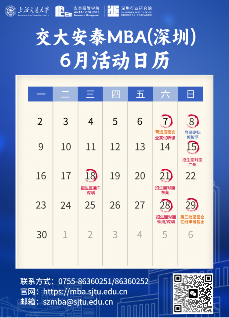2025年6月28日13:30 - 16:00,“招生直通車”活動將在上海交通大學深圳研究院A918教室舉行。活動流程包括簽到、交大安泰MBA項目介紹、學長分享游學經(jīng)歷、最新招生政策解讀及互動答疑。交大安泰MBA項目致力于培養(yǎng)商界領袖和業(yè)界精英,三十多年來成效顯著,在多個權威排名中表現(xiàn)出色,如連續(xù)六年位列2020 - 2025 QS全球MBA項目中國大陸本土商學院前三甲,連續(xù)9年進入英國《金融時報》全球MBA排名百強等。還獲得多項國際權威認證,現(xiàn)正進行以“縱橫交錯 知行合一”為戰(zhàn)略、行業(yè)研究為重點的改革。