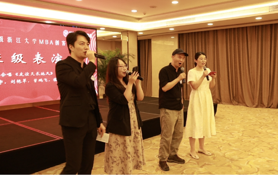 本次開(kāi)班典禮亮點(diǎn)紛呈,表演環(huán)節(jié)精彩不斷。陳棟棟、丁黎強(qiáng)、沈浙湘、何思聰帶來(lái)活力四射的舞蹈《History》,瞬間點(diǎn)燃現(xiàn)場(chǎng)氣氛;史振宇先是深情獨(dú)唱《晚安》,后又與劉艷蘋、曾鵬飛、樓丹辰一同合唱《友誼地久天長(zhǎng)》,歌聲悠揚(yáng)動(dòng)聽(tīng)。此外,同學(xué)們還與分組就座的嘉賓們展開(kāi)聊天互動(dòng)與業(yè)務(wù)交流,大家暢所欲言,商業(yè)靈感激烈碰撞。