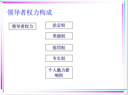 按照組織行為學(xué)的理論,領(lǐng)導(dǎo)者的權(quán)力可以解構(gòu)成五項(xiàng)子權(quán)力,分別是法定權(quán)、獎勵權(quán)、懲罰權(quán)、專長權(quán)和魅力權(quán)。
