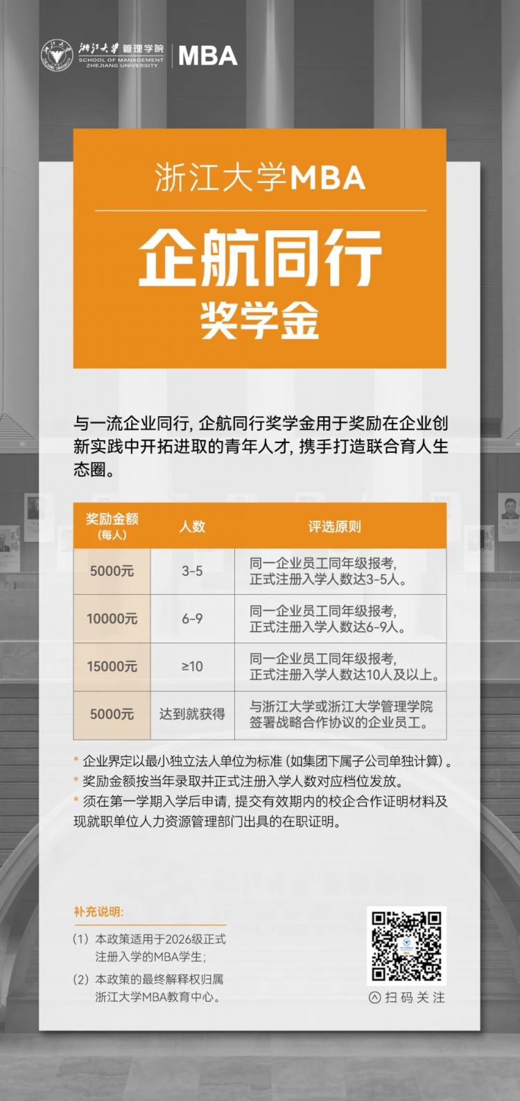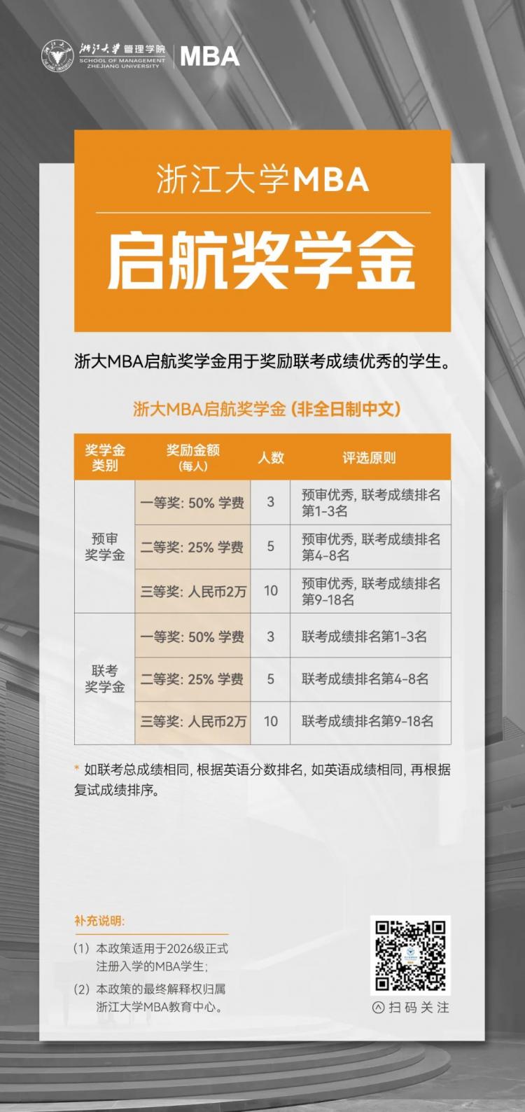 關(guān)聯(lián)問題: 浙大MBA獎(jiǎng)學(xué)金有哪些類型?企業(yè)組團(tuán)報(bào)考有何獎(jiǎng)勵(lì)?2026級(jí)MBA如何獲獎(jiǎng)學(xué)金?