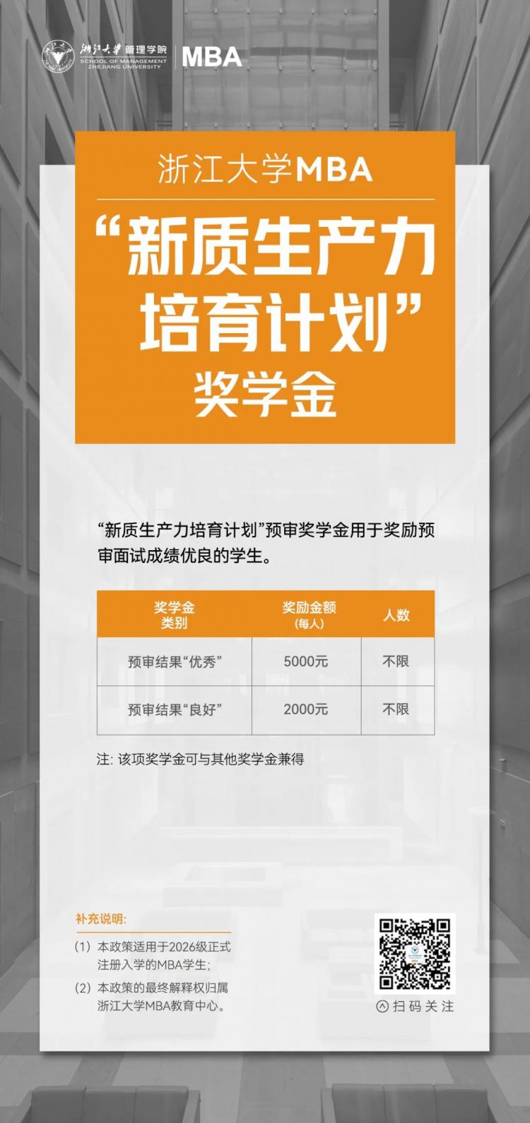 浙江大學(xué)MBA項(xiàng)目助力2026級(jí)ZJU-MBAers成為領(lǐng)導(dǎo)型和創(chuàng)新型人才。今年全面豐富獎(jiǎng)學(xué)金獎(jiǎng)勵(lì)維度,激勵(lì)學(xué)員努力拼搏。參與“新質(zhì)生產(chǎn)力培育計(jì)劃”預(yù)審并最終被錄取,可獲獎(jiǎng)學(xué)金且能與其他獎(jiǎng)學(xué)金兼得;同一企業(yè)3人及以上報(bào)考同一年級(jí),正式錄取注冊(cè)入學(xué)可獲對(duì)應(yīng)獎(jiǎng)學(xué)金;就讀期間至畢業(yè)也有多種獎(jiǎng)學(xué)金。政策適用于2026級(jí)正式注冊(cè)入學(xué)的MBA學(xué)生,有相關(guān)說明及限制,最終解釋權(quán)歸浙江大學(xué)MBA教育中心。此外,浙江省對(duì)MBA同學(xué)(非全日制碩士)也有激勵(lì)政策。浙江大學(xué)MBA招生進(jìn)行中,福州場2025年預(yù)審報(bào)名正在進(jìn)行,歡迎