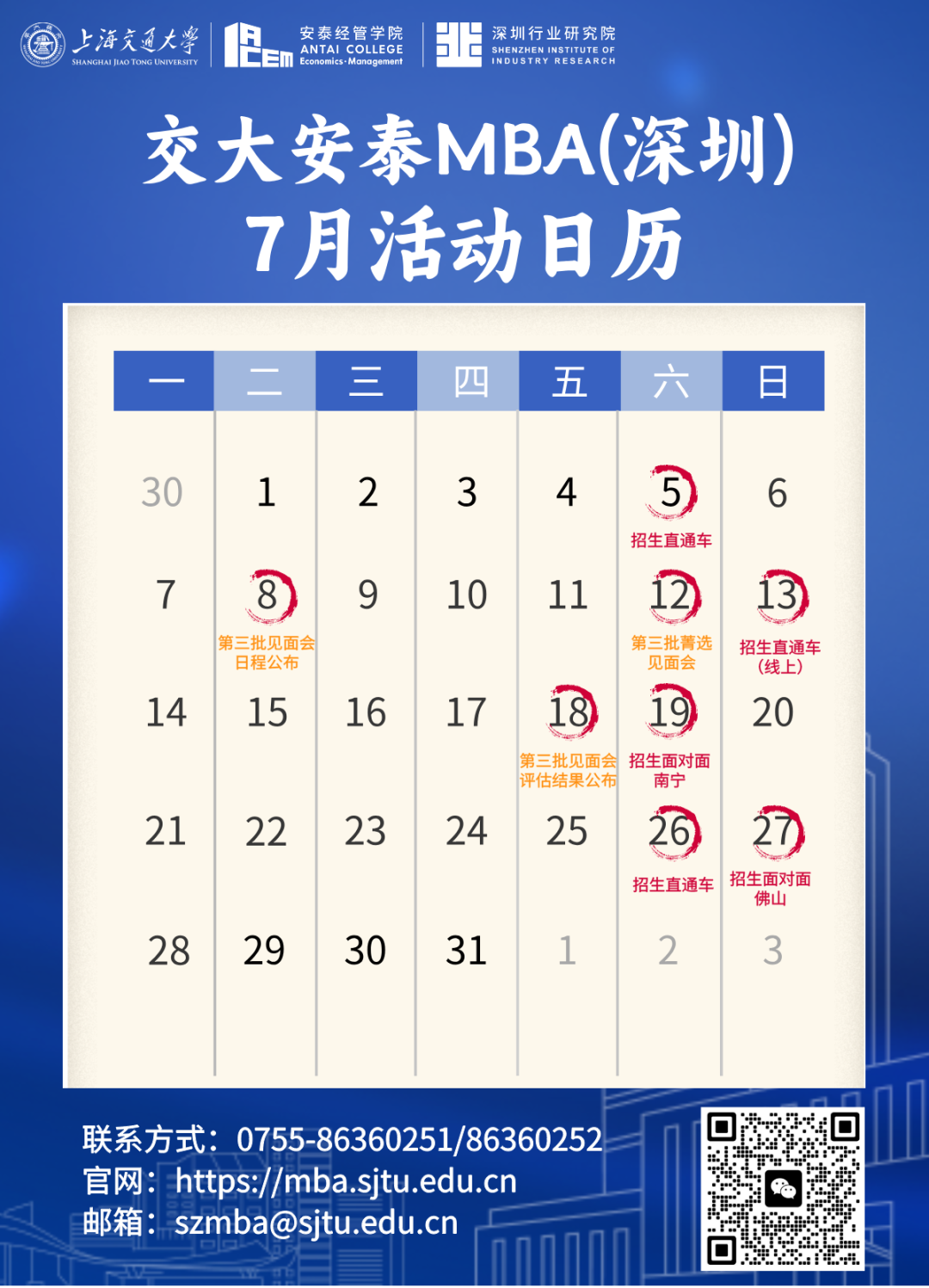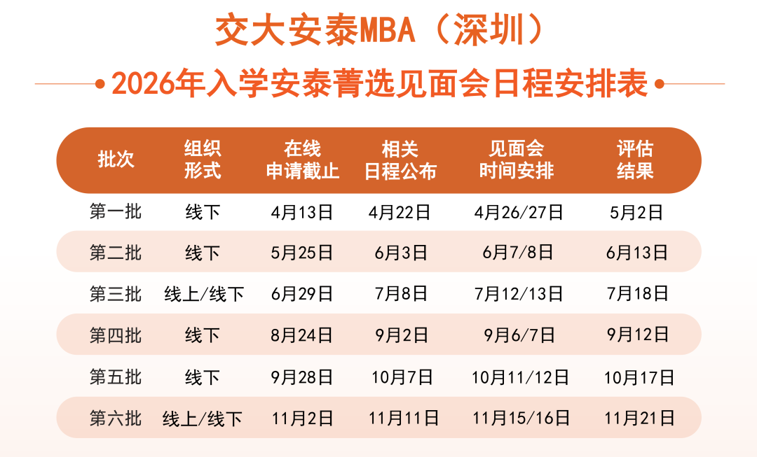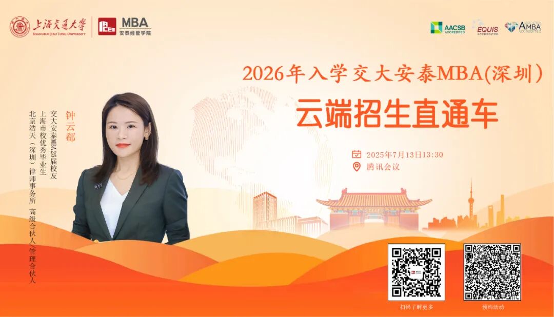 2025年7月13日(周日)13:30 - 16:00將舉辦云端招生直通車活動,活動地點(diǎn)為騰訊會議(掃碼報名獲取會議號)?;顒恿鞒贪ê灥?、交大安泰MBA項目介紹、學(xué)姐分享、最新招生政策解讀及互動答疑,分享學(xué)姐為2025屆校友鐘云郗。交大安泰MBA項目致力于培養(yǎng)商界領(lǐng)袖和業(yè)界精英,多年來在規(guī)范、質(zhì)量等方面下功夫,取得良好品牌效應(yīng)。在多個權(quán)威排名中表現(xiàn)出色,還獲得三項國際頂級權(quán)威管理教育體系認(rèn)證,目前正進(jìn)行“縱橫交錯 知行合一”戰(zhàn)略等改革。咨詢熱線0755 - 86360251、86360252 ,歡迎報名