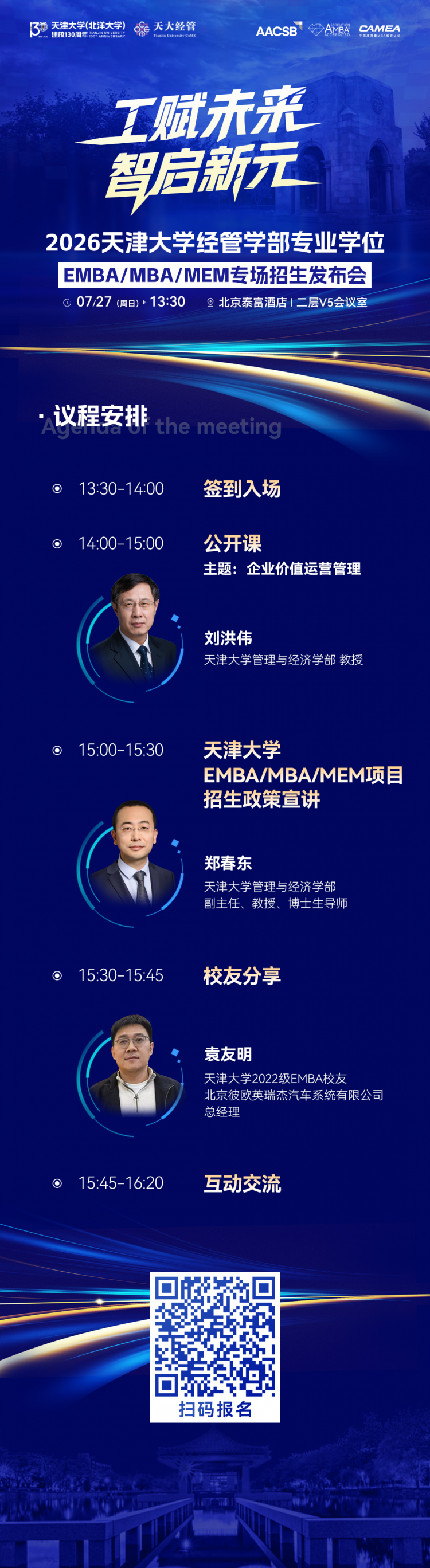 1895 年中國近代第一所現(xiàn)代大學“北洋大學堂”在天津誕生,天津大學跨越三個世紀肩負“興學強國”使命。站在科技與產(chǎn)業(yè)變革潮頭,天津大學經(jīng)管學部傳承百年底蘊,融合工科優(yōu)勢與管理智慧,將于 2025 年 7 月 27 日 13:30,在北京泰富酒店二層 V5 會議室舉辦 EMBA/MBA/MEM 專場招生發(fā)布會,掃描二維碼可報名。活動議程亮點諸多,能感受百年底蘊對當代商業(yè)領袖的賦能,三大專業(yè)學位項目同臺展示,學界專家與業(yè)界領袖剖析智能時代管理變革,還能與精英交流拓展人脈。誠邀大家屆時共赴盛會,開啟卓越旅程 。