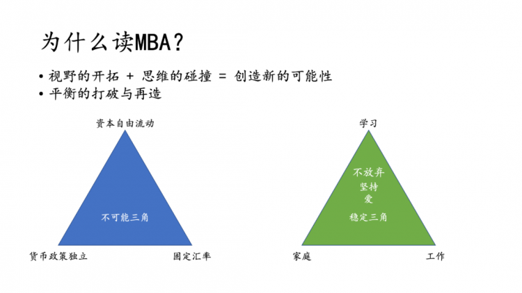 非全日制MBA的學(xué)生,無(wú)疑是 “痛苦”的,在一周緊張的工作之后緊接著兩天高強(qiáng)度的學(xué)習(xí)。在一次分享中,我調(diào)侃“學(xué)習(xí)、工作與家庭”是難以兼顧的“不可能三角”,引起了全班同學(xué)的共鳴和大笑。