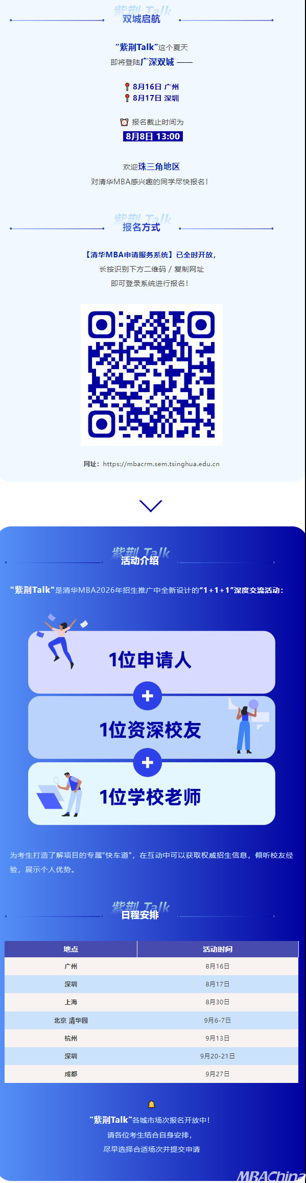 “紫荊Talk”今年夏天將登陸廣深雙城,8月16日在廣州、8月17日在深圳舉行。報名截止時間為8月8日13:00,歡迎珠三角地區(qū)對清華MBA感興趣的同學盡快報名。報名方式為通過【清華MBA申請服務系統(tǒng)】,可長按識別二維碼或復制網(wǎng)址(https://mbacrm.sem.tsinghua.edu.cn )登錄系統(tǒng)報名。“紫荊Talk”是清華MBA2026年招生推廣中全新設計的“1+1+1”深度交流活動,能讓考生獲取權威招生信息等。此外,還公布了上海、北京清華園、杭州、深圳、成都等地的活動時間,各城市場次報名