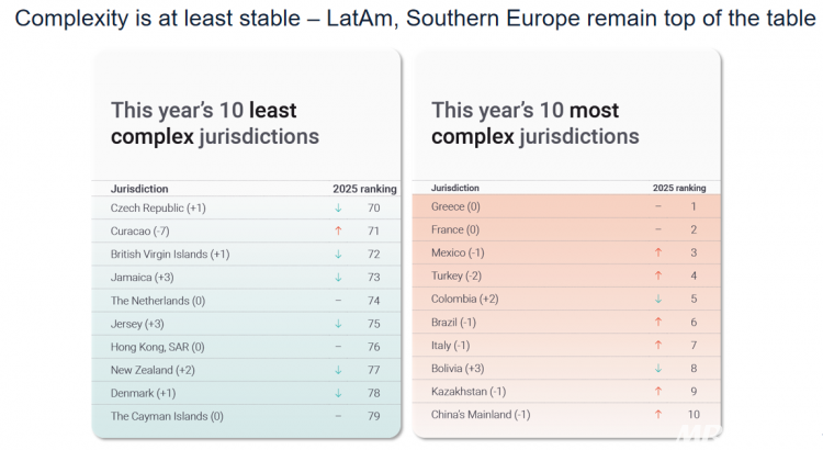 在GBCI的最新報告中,Mark Weil展示了一張“戰(zhàn)略溫度圖”:哪些市場雖復(fù)雜但高潛力?哪些國家制度友好但增長疲軟?哪些地區(qū)正在成為新的戰(zhàn)略橋梁?仔細(xì)觀察可以發(fā)現(xiàn),雖然各國制度復(fù)雜性年年有變,但真正“高復(fù)雜度”的市場分布長期集中于拉丁美洲、南歐與中東等地區(qū)。這些國家通常具備共同特征:監(jiān)管繁復(fù)、合規(guī)壁壘高、政策波動性強,而這些往往意味著更高的合規(guī)成本和更低的容錯空間。