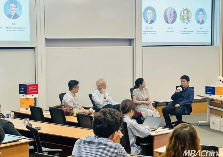 圓桌嘉賓(左二向右)依次為:Mark Weil、張曉蓉、吳筠,TMF Group全球業(yè)務(wù)拓展部資深經(jīng)理、復(fù)旦-BI MBA項目2023級39班校友陳昊(左一)主持圓桌會議。