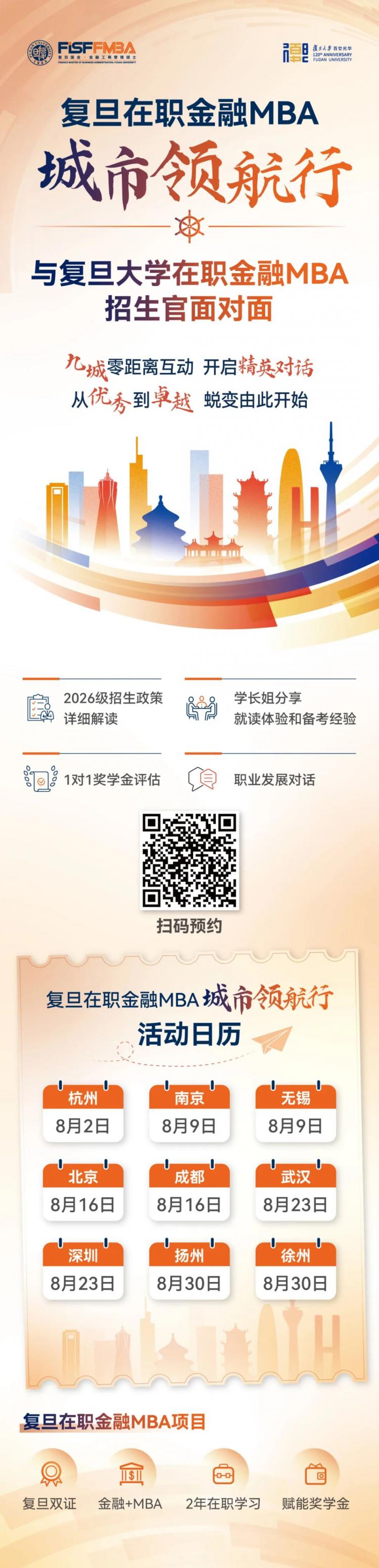 當(dāng)職場進(jìn)階遇瓶頸、行業(yè)變革帶來新機遇時,本周六(8月16日),復(fù)旦大學(xué)在職金融MBA招生官與精英校友團將前往北京和成都,帶來深度交互的「領(lǐng)航級」對話。內(nèi)容包括政策解碼2026級招生政策與申請攻略,學(xué)長姐分享“在職攻讀”時間管理術(shù)與收獲,提供資源賦能1對1評估、獎學(xué)金及定制化職業(yè)發(fā)展診斷,前瞻洞察金融MBA課程與行業(yè)上升路徑的匹配??牲c擊預(yù)約,成功報名后通知具體時間、地點。該項目旨在尋找有明確規(guī)劃、深耕行業(yè)且希望提升金融理解與管理能力,成為行業(yè)領(lǐng)袖的人才,同時推薦相關(guān)閱讀助力申請報名。