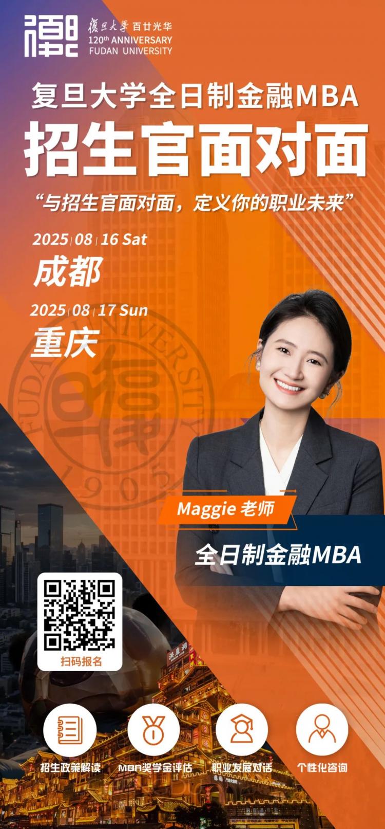 職場遇瓶頸、想系統(tǒng)學(xué)金融知識或有海外深造想法卻迷茫的人士,可參加復(fù)旦招生官面對面活動。活動中,招生官將詳解申請流程,分享獎學(xué)金“通關(guān)秘籍”,規(guī)劃職業(yè)發(fā)展藍圖并提供個性化咨詢。全國見面會在武漢(8月23日)、深圳(9月6日)等地開放預(yù)約。2026級FMBA FT+ 火熱招生,輸入背景可獲1v1獎學(xué)金評估。該項目專為有志投身國際金融行業(yè)的青年才俊打造,學(xué)制兩年,英文授課,學(xué)生畢業(yè)獲相應(yīng)學(xué)位學(xué)歷。項目還與多所一流院校合作,提供海外學(xué)位契機。想深度體驗可報名9月13日的META CAMP ,領(lǐng)取復(fù)旦學(xué)生一日體驗卡