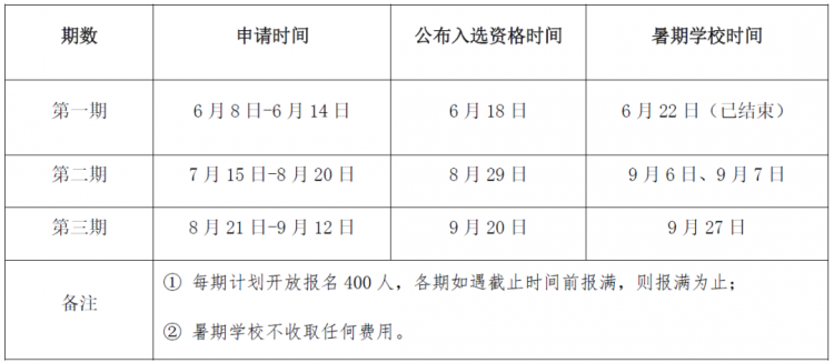 暑期學(xué)校共開設(shè)三期,時間如下:
