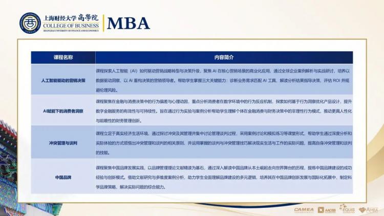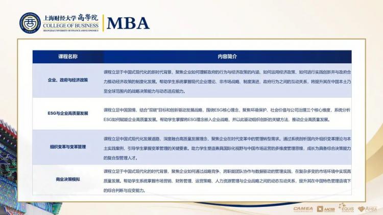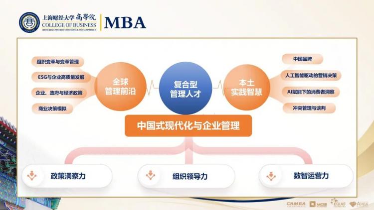 上海財(cái)經(jīng)大學(xué)商學(xué)院MBA綜合精英班-中國式現(xiàn)代化與企業(yè)管理方向,立足中國特色發(fā)展道路,深度融合"高質(zhì)量發(fā)展"理念,構(gòu)建全方位管理人才培養(yǎng)體系。課程聚焦組織變革、ESG發(fā)展、經(jīng)濟(jì)政策分析等核心領(lǐng)域,結(jié)合AI驅(qū)動(dòng)的商業(yè)決策與全球管理前沿,助力企業(yè)家在變革中把握機(jī)遇,推動(dòng)中國企業(yè)高質(zhì)量發(fā)展。通過理論與實(shí)踐的結(jié)合,學(xué)生將掌握中國式現(xiàn)代化下的管理范式,成為兼具國際視野與本土智慧的商業(yè)領(lǐng)袖。