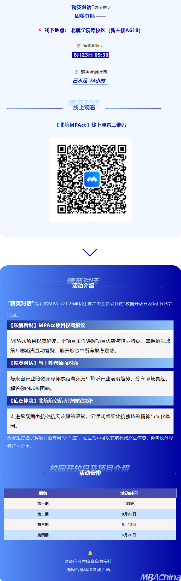 “精英對話”作為北航MPAcc2026年招生推廣中全新設(shè)計的“校園開放日及項目介紹”活動,即將在這個夏天登陸。線下地點為北航學(xué)院路校區(qū)(新主樓A618),8月23日09:30開啟宣講,距離宣講已不足24小時,也可線上觀看?;顒影绢I(lǐng)航者說】MPAcc項目權(quán)威解讀,聽項目主任講優(yōu)勢、培養(yǎng)特點及招生政策并互動答疑;【精英對話】與行業(yè)資深導(dǎo)師王峰面對面交流;【底蘊體驗】探秘北航航空航天博物館。活動共四期,第一期已結(jié)束,第二期8月23日,第三期9月13日,第四期9月28日,考生可依自身安排選擇場次參加 。