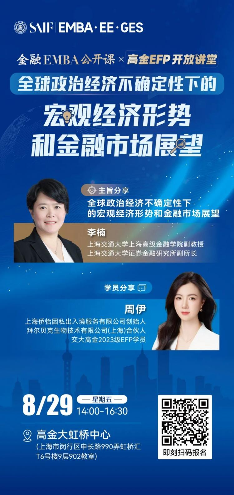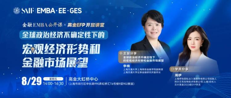 本次高金EMBA公開課暨EFP開放講堂將于2025年8月29日(周五)下午在高金上海大虹橋中心舉行,特邀上海交通大學(xué)上海高級金融學(xué)院副教授、上海交通大學(xué)證券金融研究所副所長李楠帶來主旨演講《全球政治經(jīng)濟不確定性下的宏觀經(jīng)濟形勢和金融市場展望》,同時邀請EFP學(xué)員,上海僑怡因私出入境服務(wù)有限公司創(chuàng)始人、拜爾貝克生物技術(shù)有限公司(上海) 合伙人周伊進行分享,資深項目老師還將詳解高金EMBA及EFP項目特色、招生政策、錄取標準、面試安排及最新重磅推出的“科技強國人才培養(yǎng)專項計劃”?;顒酉挥邢?,歡迎掃碼報名,開啟您的高金學(xué)習(xí)之旅,共探前沿管理智慧,賦能未來成長!