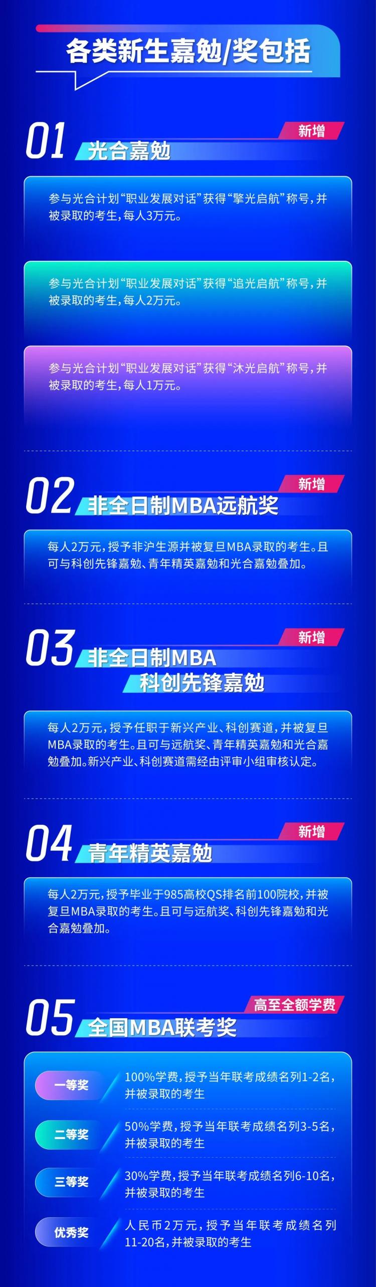 復(fù)旦MBA最關(guān)注“人”的成長(zhǎng),將與學(xué)員一路同行,助力其蛻變、突破,實(shí)現(xiàn)多元進(jìn)階。致力于培養(yǎng)兼具全球視野與中國(guó)國(guó)情認(rèn)知的青年精英、未來(lái)領(lǐng)袖,學(xué)院為此設(shè)立多項(xiàng)新生嘉勉/獎(jiǎng)項(xiàng),為學(xué)員夢(mèng)想增添動(dòng)力。成長(zhǎng)沒有邊界,未來(lái)充滿希望。從學(xué)員決定出發(fā)起就會(huì)相伴,種一棵樹最好的時(shí)間是現(xiàn)在,歡迎各位同學(xué)申請(qǐng)復(fù)旦MBA項(xiàng)目。此內(nèi)容解釋權(quán)歸復(fù)旦MBA項(xiàng)目所有,點(diǎn)擊“閱讀原文”可申請(qǐng)。