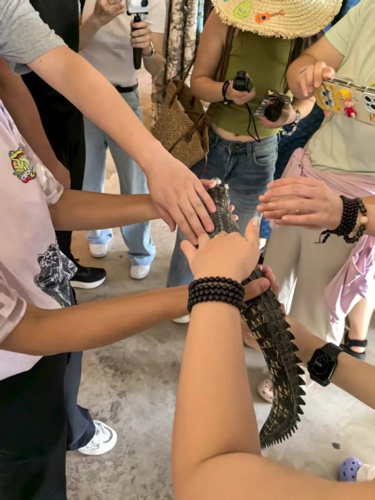 隨后,同學(xué)們參訪了鱷魚養(yǎng)殖場,觀賞到了震撼的鱷魚表演與喂食過程。數(shù)十條咸水鱷從水底浮起,卻沒有預(yù)想中的狂躁爭搶。鱷魚園嚴格控制喂食量, “過度喂食會導(dǎo)致水質(zhì)惡化,也會讓鱷魚失去自然捕食能力?!?而這些喂養(yǎng)鱷魚的雞肉來自園區(qū)與當(dāng)?shù)剞r(nóng)戶合作的生態(tài)養(yǎng)殖場,連雞飼料都是用鱷魚糞便發(fā)酵后的副產(chǎn)品制成,實現(xiàn)了社區(qū)共生的溫柔實踐。
