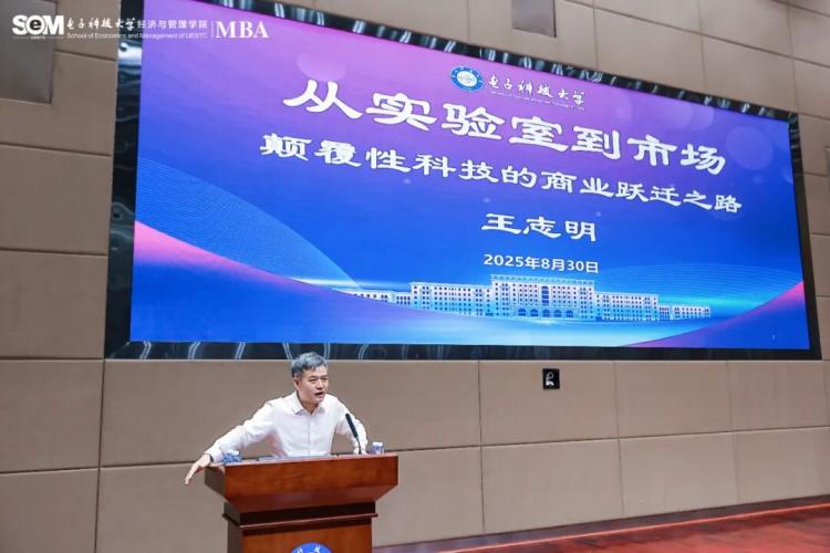 中場休息后,“明勢(shì)講堂”特邀電子科技大學(xué)物理學(xué)院院長、基礎(chǔ)與前沿研究院創(chuàng)始院長王志明教授帶來題為“從實(shí)驗(yàn)室到市場:顛覆性科技的商業(yè)躍遷之路”的精彩演講。他結(jié)合自身基礎(chǔ)與前沿研究院十年的工作經(jīng)歷,以及在物理學(xué)院的創(chuàng)新實(shí)踐,深入剖析了量子計(jì)算、人工智能等前沿科技實(shí)現(xiàn)商業(yè)化轉(zhuǎn)化的關(guān)鍵路徑。他以實(shí)際案例為依托,為新生拓展了科技與管理深度融合的思維視野,并指出當(dāng)前市場亟需既懂技術(shù)又善管理的創(chuàng)新型復(fù)合人才。他還表達(dá)了與我院MBA師生進(jìn)一步合作的期待,希望共同探索科技成果轉(zhuǎn)化,推動(dòng)更多創(chuàng)新項(xiàng)目服務(wù)于社會(huì)發(fā)展。