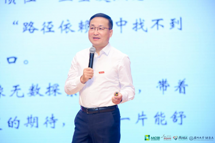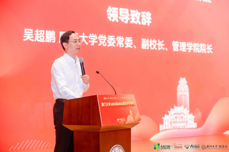 廈門大學黨委常委、副校長、管理學院院長吳超鵬教授致辭。他在致辭中寄語新生:要成為“人機共生”的引領(lǐng)者,駕馭智能時代的戰(zhàn)略變革;在全球化與本土化的張力中探索創(chuàng)新路徑,貢獻中國管理智慧;踐行可持續(xù)發(fā)展,重塑企業(yè)長期價值。他勉勵同學們知行合一,不斷反思與成長,完成從職業(yè)經(jīng)理人到商業(yè)引領(lǐng)者的蛻變,在百年廈大書寫無愧于時代的新篇章。