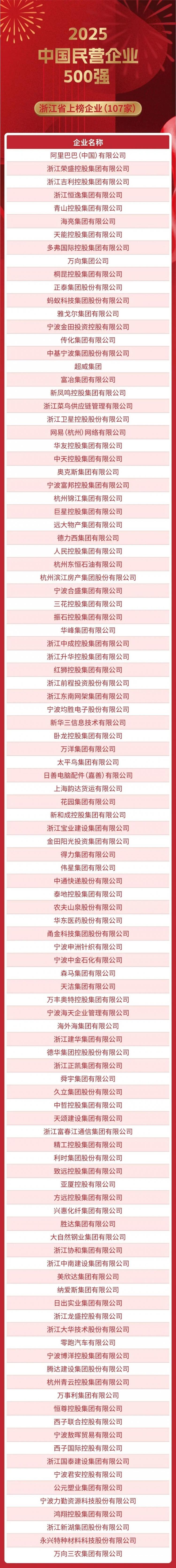 在“2025中國民營企業(yè)500強”中:浙江共有107家企業(yè)上榜,較2024年的106家凈增1家,上榜數(shù)量連續(xù)27年位居全國首位,持續(xù)鞏固民營經濟大省優(yōu)勢。