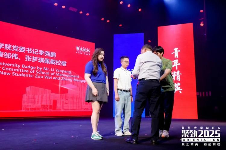 復(fù)旦大學(xué)管理學(xué)院黨委書記李堯鵬向2025級(jí)新生代表鄒偉、張夢(mèng)琪頒發(fā)?;?。