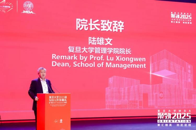 復(fù)旦大學(xué)管理學(xué)院院長(zhǎng)陸雄文致辭,分享對(duì)未來(lái)MBA教育的思考和對(duì)新生的建議。
