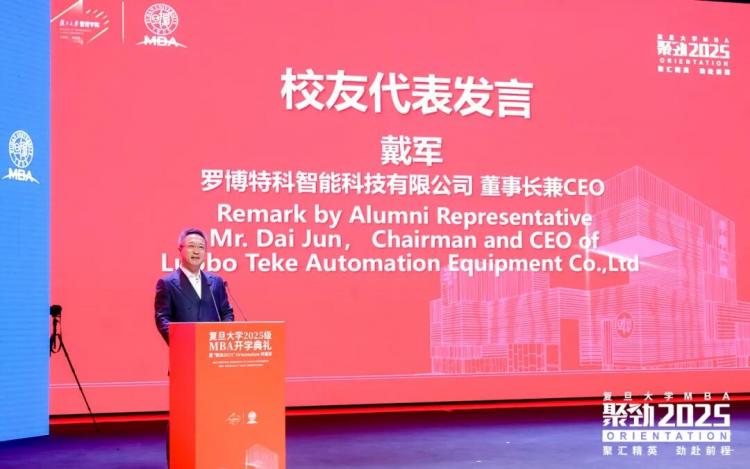 復(fù)旦大學(xué)MBA項(xiàng)目2006級(jí)校友、羅博特科智能科技股份有限公司董事長(zhǎng)兼CEO戴軍做校友代表致辭。