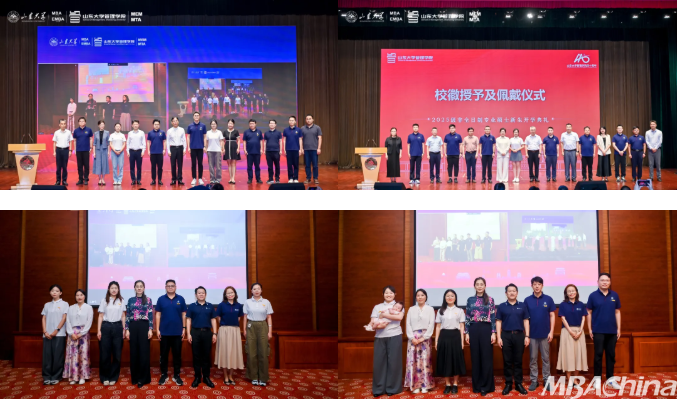 ?;帐谟鑳x式中,特邀嘉賓、山東大學(xué)研究生院及管理學(xué)院領(lǐng)導(dǎo)和教師共同為新生代表佩戴?;?。