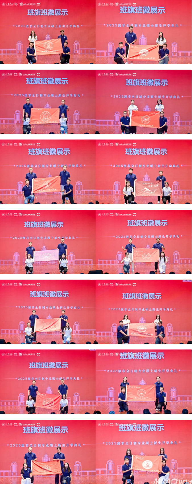 來自山東大學(xué)管理學(xué)院、經(jīng)濟(jì)學(xué)院、國際創(chuàng)新轉(zhuǎn)化學(xué)院、商學(xué)院的各班代表依次展示了班旗與班徽,彰顯新生集體的凝聚力。