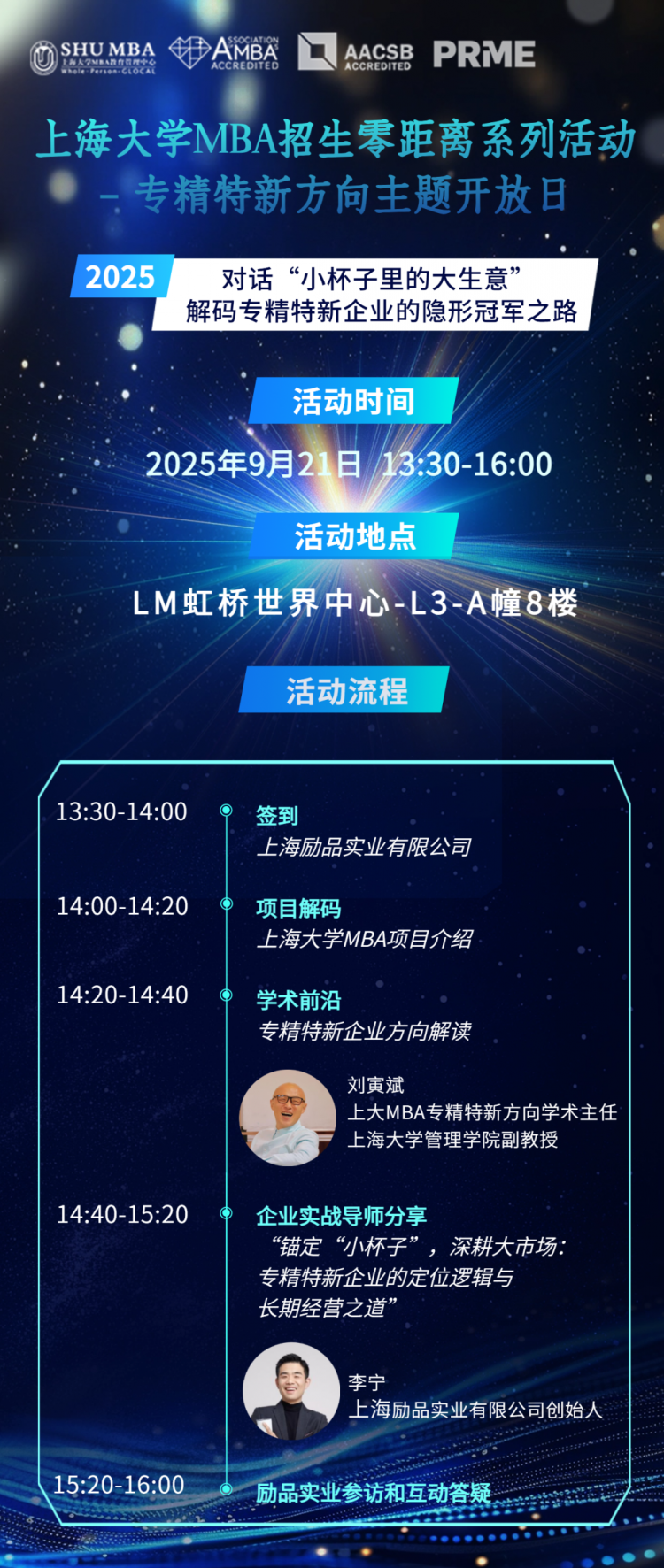 2025 年 9 月 21 日,上海大學(xué) MBA 將開啟 “專精特新企業(yè)創(chuàng)新實踐” 交流活動。特邀咖啡杯定制標(biāo)桿企業(yè)勵品實業(yè),揭秘其從服務(wù)中小咖啡店到成為國際品牌合作伙伴的成長邏輯,解鎖中小企業(yè)破局之道?;顒恿咙c有:一是看勵品實業(yè)如何在矛盾需求中平衡,在細分市場挖掘機遇;二是企學(xué)對話,勵品實業(yè)創(chuàng)始人分享實戰(zhàn)方法,上海大學(xué)副教授拆解核心競爭力,參與者能獲 “小而美” 生存邏輯等。此外,上大 MBA 招生老師將介紹招生政策。還介紹了上大 MBA 的諸多成就與優(yōu)勢,以及辦學(xué)理念、愿景、特色等內(nèi)容,并提供了報名通