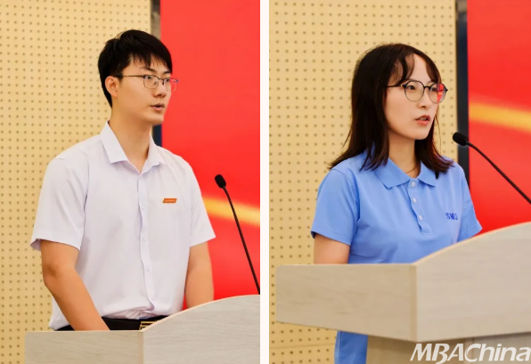 老生代表2023級(jí)MPAcc李玉璁和新生代表2025級(jí)MEM魯瑜分別上臺(tái)發(fā)言。