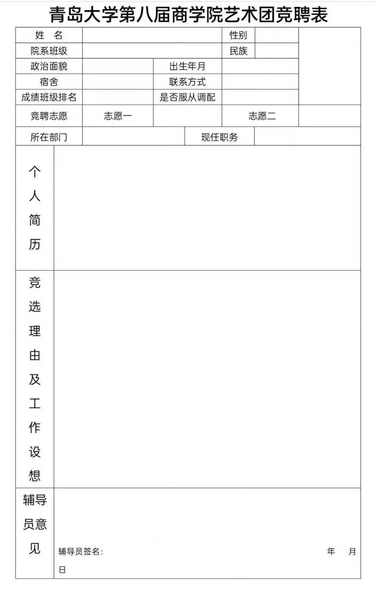 「請(qǐng)報(bào)名同學(xué)填寫(xiě)電子表《青島大學(xué)第八屆商學(xué)院藝術(shù)團(tuán)競(jìng)聘表》(電子版報(bào)名表無(wú)需填寫(xiě)導(dǎo)員意見(jiàn))將填寫(xiě)后的報(bào)名表發(fā)送至郵箱:qdsxyyst0015@163.com。