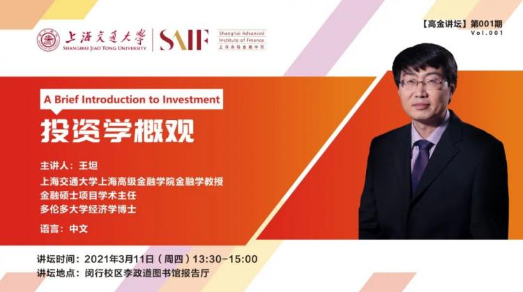 3月11日,首期活動將邀請上海交通大學(xué)上海高級金融學(xué)院金融學(xué)教授,金融碩士項目學(xué)術(shù)主任王坦做客。他將以“投資學(xué)概觀”為題,進(jìn)行主題分享。