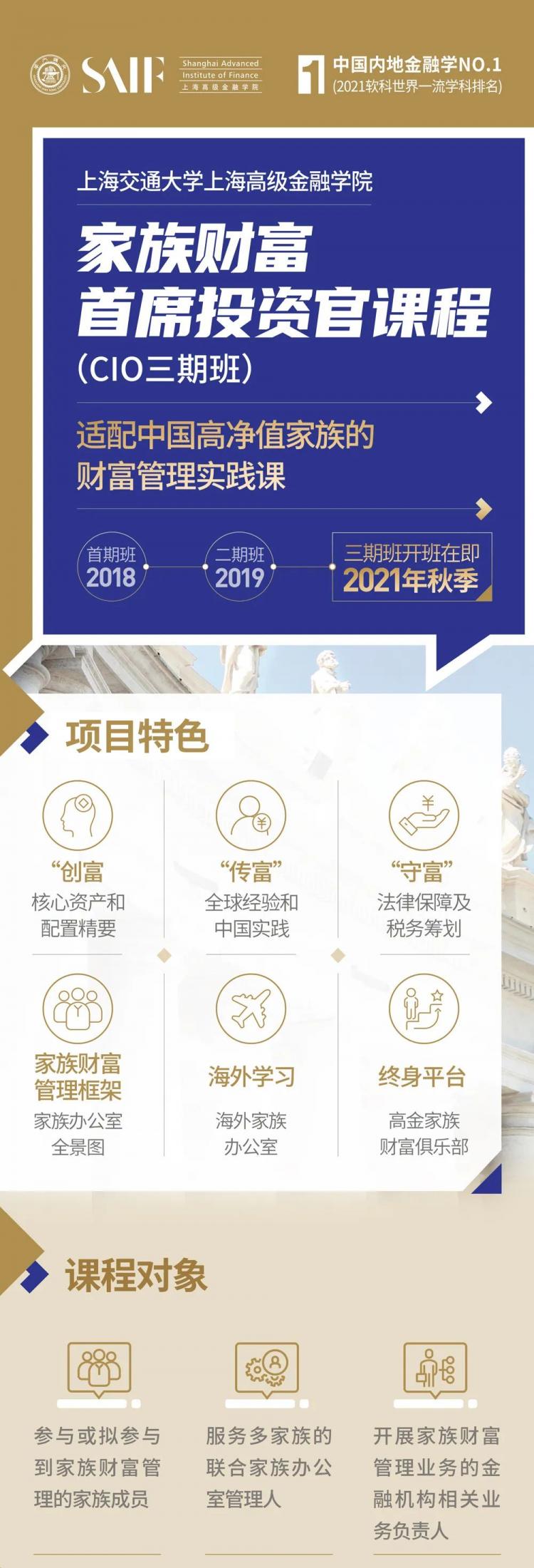 上海交通大學(xué)上海高級(jí)金融學(xué)院于國(guó)內(nèi)率先推出適配中國(guó)高凈值家族的財(cái)富管理實(shí)踐課——家族財(cái)富首席投資官課程,三期班將于2021年11月正式開班。作為高金最具特色的旗艦項(xiàng)目之一,課程專為參與家族財(cái)富管理的家族成員和從事家族財(cái)富管理業(yè)務(wù)的相關(guān)機(jī)構(gòu)負(fù)責(zé)人度身而設(shè)。學(xué)員將與高金頂尖金融師資、投資界資深大咖、世界一流家族辦公室,共同探討中國(guó)式家族財(cái)富管理與傳承的最佳實(shí)踐。