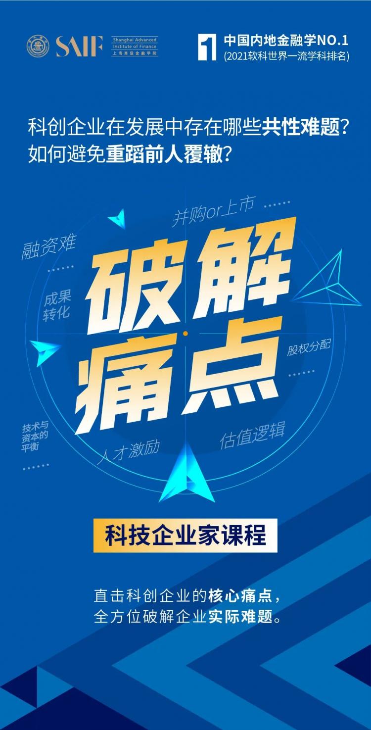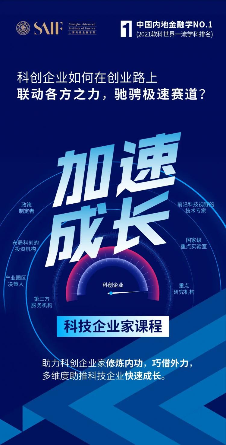 在這個(gè)科技推動(dòng)變革的大時(shí)代,科技與資本的碰撞將孕育層出不窮的市場(chǎng)機(jī)遇。上海交通大學(xué)上海高級(jí)金融學(xué)院經(jīng)過前期充分打磨,重磅推出“科技企業(yè)家”課程,以科創(chuàng)企業(yè)所面臨的實(shí)際問題為導(dǎo)向,破解科創(chuàng)企業(yè)發(fā)展中遇到的核心痛點(diǎn)難點(diǎn),提升科技企業(yè)家的資本運(yùn)作與創(chuàng)新管理能力,助力企業(yè)馳騁極速賽道。