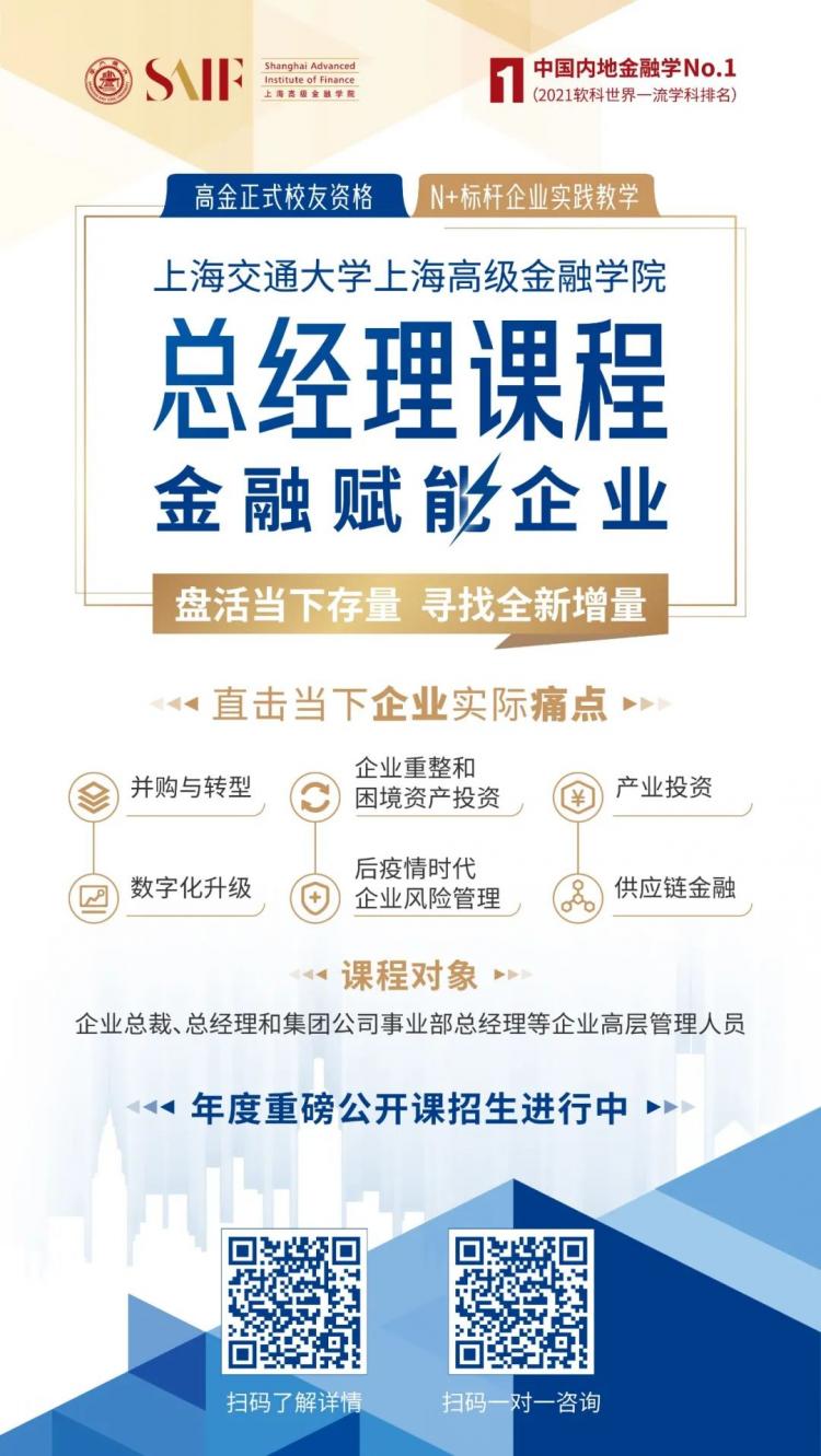 為助力企業(yè)管理者在這個創(chuàng)新和變革的大時代打開思路的突破口,賦予管理者「盔甲」和「武器」,真正幫助他們保持優(yōu)勢,逆勢增長,上海交通大學上海高級金融學院(SAIF)高層管理教育于2021年重磅推出為企業(yè)管理者度身設(shè)計的高金《總經(jīng)理課程》,以金融為突破口,直擊現(xiàn)代企業(yè)六大實際痛點,幫助企業(yè)管理者保持最強的斗志、解決最疑惑的問題、盤活存量、尋找增量。