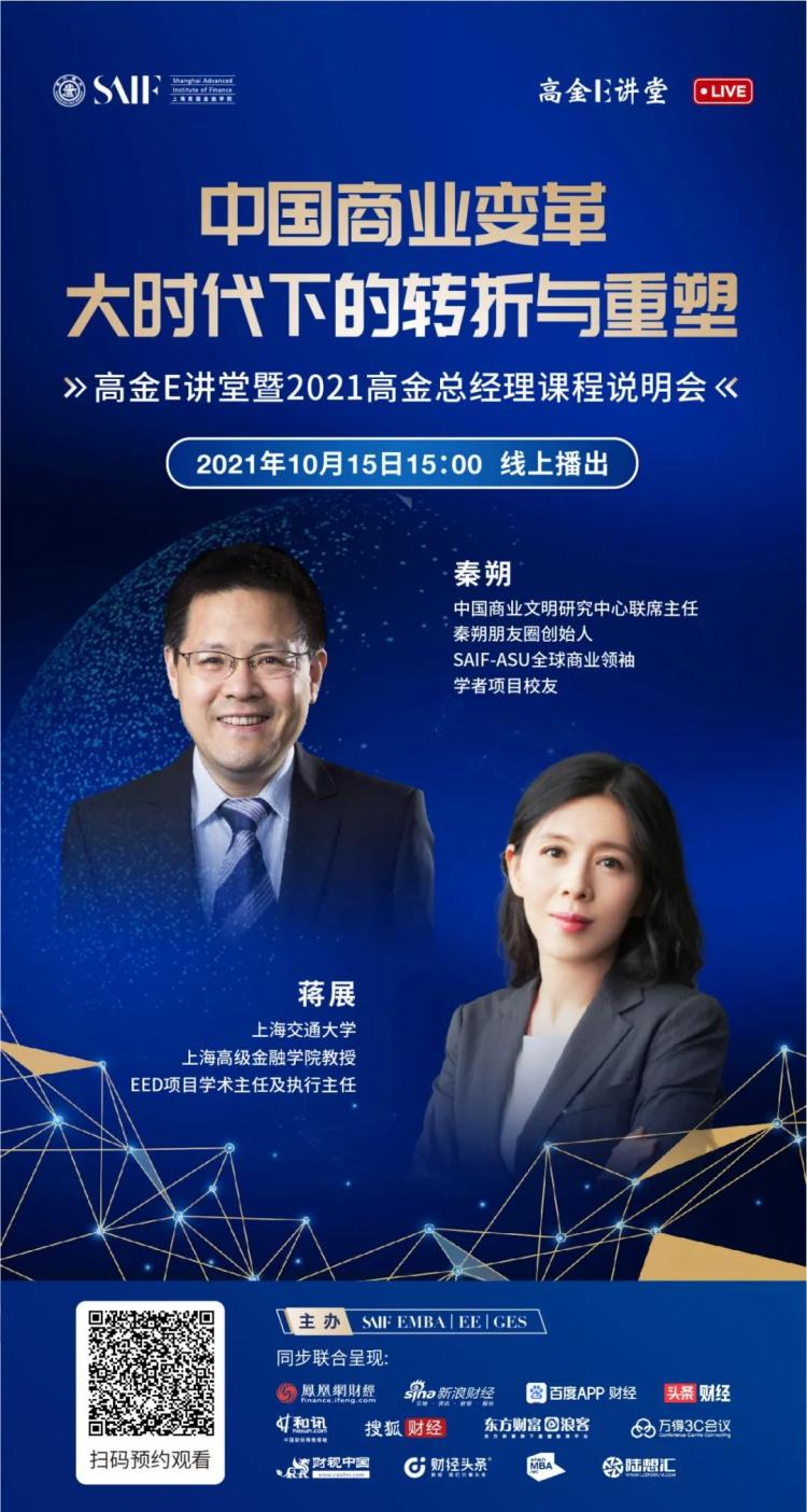 本次高金E講堂將邀請中國商業(yè)文明研究中心聯(lián)席主任、秦朔朋友圈創(chuàng)始人、SAIF-ASU全球商業(yè)領(lǐng)袖學者項目校友、SAIF金融EMBA校友秦朔,上海交通大學上海高級金融學院教授、EED項目學術(shù)主任及執(zhí)行主任蔣展同臺分享中國商業(yè)變革大時代下的轉(zhuǎn)折與重塑,并解讀2021高金總經(jīng)理課程特色及招生政策,歡迎報名參加。