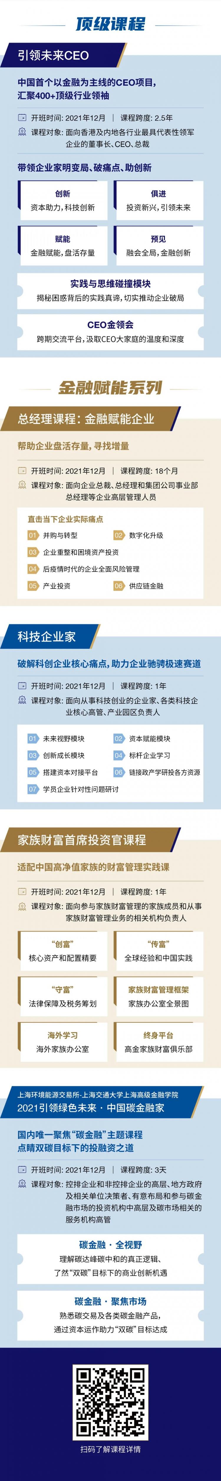 上海高級金融學(xué)院高層管理教育項目整合全球金融及各領(lǐng)域頂級教育資源,堅持內(nèi)容與形式的多元化創(chuàng)新,以金融為突破口,用最落地的方式,破解現(xiàn)代企業(yè)實際痛點,為實現(xiàn)企業(yè)及個人的跨越式成長持續(xù)蓄力。