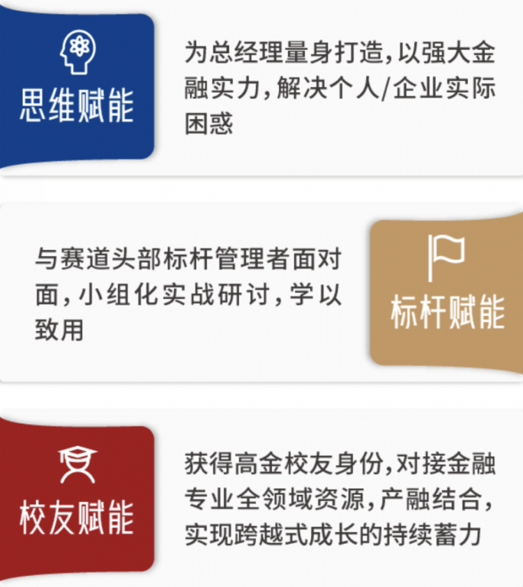 學(xué)員還將獲得高金校友身份,融入高金多元豐富的校友網(wǎng)絡(luò),對接金融全領(lǐng)域校友資源,產(chǎn)融結(jié)合,在學(xué)院的終身學(xué)習(xí)平臺上實現(xiàn)個人和企業(yè)的跨越式成長。