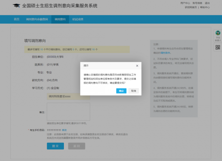 2、在允許填寫調(diào)劑意向的時間內(nèi),一位考生最多可填寫10個平行調(diào)劑意向,并且提交成功后不可取消或更改。