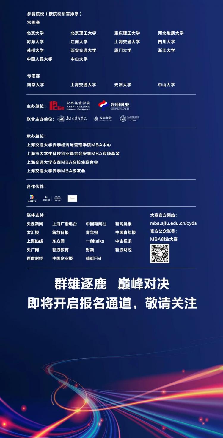 創(chuàng)新創(chuàng)業(yè)教育聯(lián)盟峰會(huì)報(bào)名通道開啟10月23日至24日,2021年“光明優(yōu)倍”杯第十九屆中國MBA創(chuàng)業(yè)大賽全國總決賽將于上海交通大學(xué)徐匯校區(qū)舉辦,我們誠摯地期待您的出席。