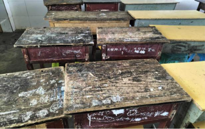 現(xiàn)在學(xué)校使用的課桌依然是陳舊的雙人木桌多次維修后維持使用的,部分課桌還是從鄰近的熊寨小學(xué)、營(yíng)上小學(xué)等調(diào)過(guò)來(lái)的舊課桌。