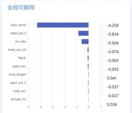 全局可解釋性:如果說局部可解釋性對應的業(yè)務場景是貸款申請被拒絕后,銀行業(yè)務人員可以看出是是哪一項貸款條件沒有達標,那么全局可解釋性就是在為借款人辦理申請之前,為銀行的業(yè)務部門全體人員提供一個整體的貸款指標定性要求以及重要性占比,幫助業(yè)務人員更好地理解哪些特征對于幫助客戶成功的申請貸款更為重要,從而更為精準的篩選目標人群,在提高貸款通過率的同時也確保銀行風控管理的準確性,進一步促進業(yè)務人員理解并信任黑盒模型。