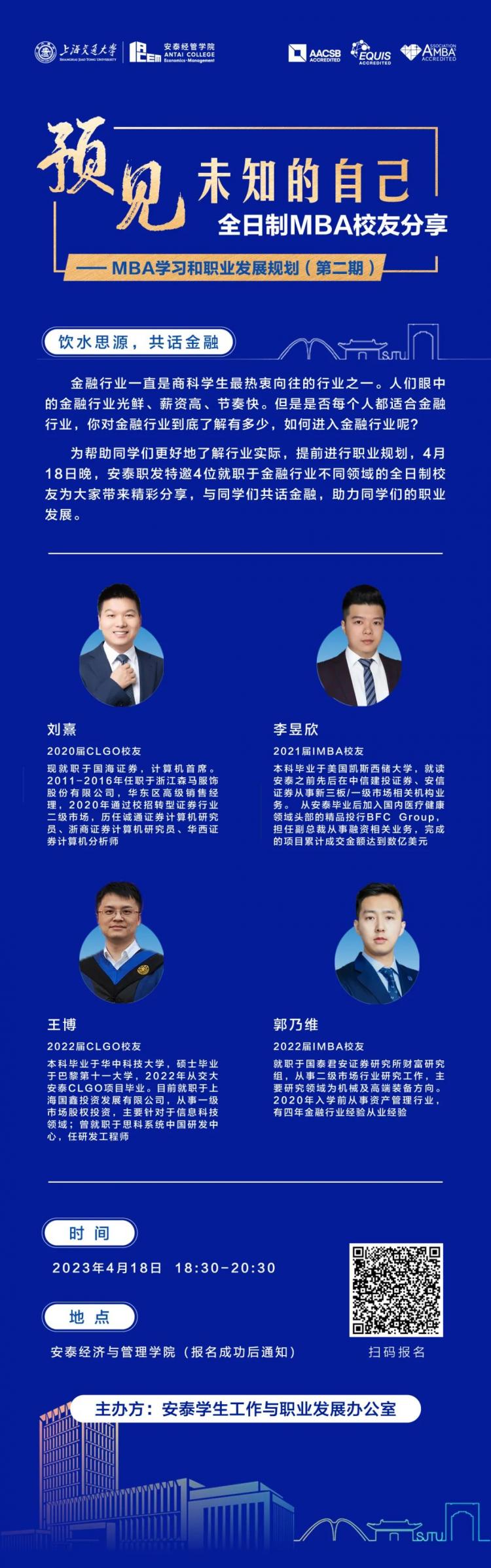 上海交大安泰經管學院CDC校友分享活動,面向交大安泰MBA全日制考生開放金融行業(yè)專場限量席位!