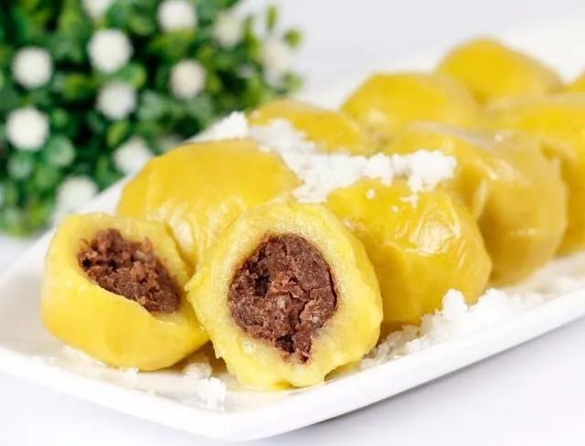 粘豆包,外形酷似元宵,大小如雞蛋,色金黃,有粘度。皮是用大黃米面做的,餡兒是用蕓豆做的。粘豆包是東北人春節(jié)期間喜歡吃的一種美食,起源于山西長(zhǎng)治的“黃蒸”。在東北地區(qū),粘豆包一般是在冬季開(kāi)始的時(shí)候制作,然后放入戶外的缸中保存過(guò)冬。