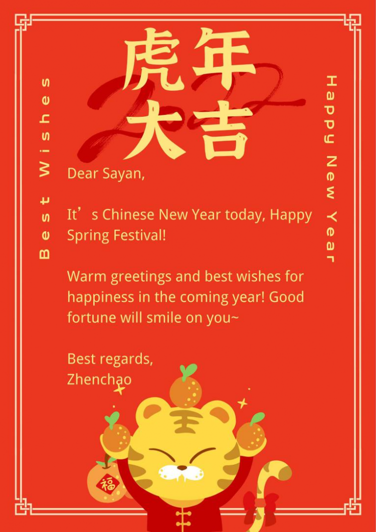 因疫情與局勢原因,我一直在校內(nèi)進行遠程工作,很遺憾不能在線下給同事們帶來中國春節(jié)的氛圍。因此我為同事準備了電子賀卡,希望可以傳遞出來自中國的美好祝福。同時祝愿商學院的老師同學們新年快樂,虎年大吉,萬事順意!