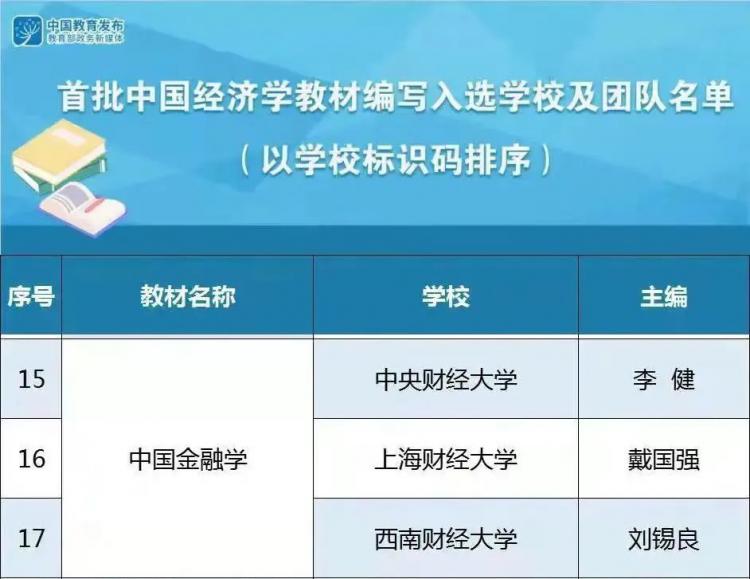 2020年,根據(jù)《國家教材委員會辦公室關(guān)于開展首批中國經(jīng)濟學(xué)教材申報工作的通知》(國教材辦【2020】5號),國家教材委員會啟動了首批中國經(jīng)濟學(xué)教材申報工作。我校積極組織,整合全校經(jīng)濟學(xué)科師資力量,組建多個高水平團隊申報,最終戴國強教授領(lǐng)銜的《中國金融學(xué)》團隊成功入選,成為首批9種中國經(jīng)濟學(xué)教材之一。 中國經(jīng)濟學(xué)教材的編寫已納入馬工程重點教材建設(shè)工作,對于推動我國經(jīng)濟高質(zhì)量發(fā)展,推進形成中國經(jīng)濟學(xué)理論體系和教材體系具有重大意義。