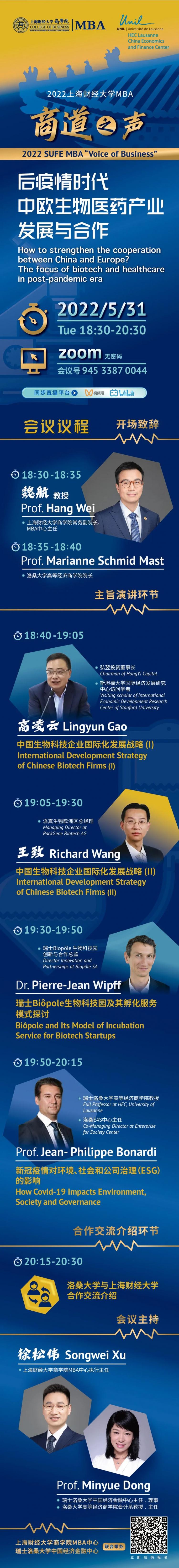 開場(chǎng)致辭嘉賓:魏航教授,上海財(cái)經(jīng)大學(xué)商學(xué)院常務(wù)副院長(zhǎng)、MBA中心主任18:35-18:40開場(chǎng)致辭嘉賓:Prof. Marianne Schmid Mast,洛桑大學(xué)高等經(jīng)濟(jì)商學(xué)院院長(zhǎng)18:40-19:05 主旨分享1:中國(guó)生物科技企業(yè)國(guó)際化發(fā)展戰(zhàn)略(Ⅰ)主講人:高凌云,弘翌投資董事長(zhǎng)、斯坦福大學(xué)國(guó)際經(jīng)濟(jì)發(fā)展研究中心訪問(wèn)學(xué)者19:05-19:30 主旨分享2:中國(guó)生物科技企業(yè)國(guó)際化發(fā)展戰(zhàn)略(Ⅱ)主講人:王致, 派真生物歐洲區(qū)總經(jīng)理19:30-19:50主旨分享3:瑞士Bi?pole生物科技園及其孵化服務(wù)模式探討主講人:Dr. Pierre-Jean Wipff,瑞士Biop?le生物科技園創(chuàng)新與合作總監(jiān)19:50-20:15主旨分享4:新冠疫情對(duì)環(huán)境、社會(huì)和公司治理(ESG)的影響主講人:Prof. Jean- Philippe Bonardi,瑞士洛桑大學(xué)高等經(jīng)濟(jì)商學(xué)院教授,洛桑E4S中心主任20:15-20:30洛桑大學(xué)與上海財(cái)經(jīng)大學(xué)合作交流介紹環(huán)節(jié)會(huì)議主持:徐松偉,上海財(cái)經(jīng)大學(xué)商學(xué)院MBA中心執(zhí)行主任Minyue DONG,瑞士洛桑大學(xué)中國(guó)經(jīng)濟(jì)金融中心主任﹑理事,洛桑大學(xué)高等經(jīng)濟(jì)商學(xué)院會(huì)計(jì)系教授、主任